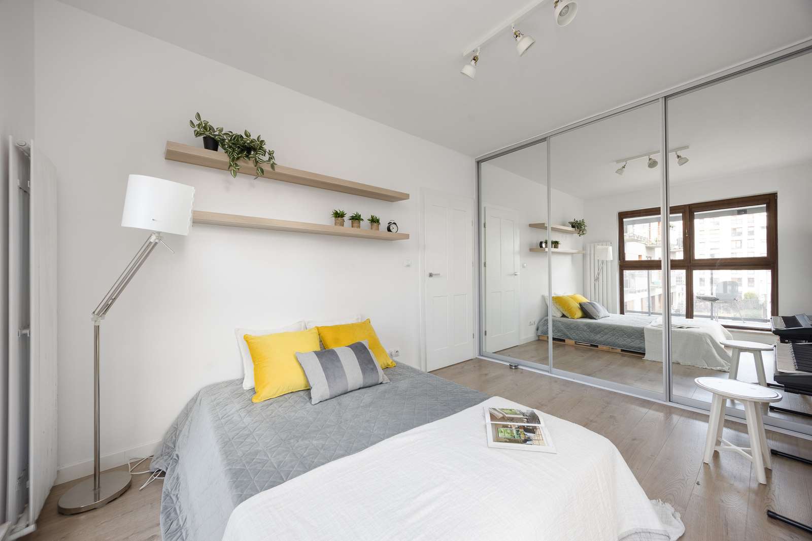 - Hol – z pojemną szafą w zabudowie z lustrem.